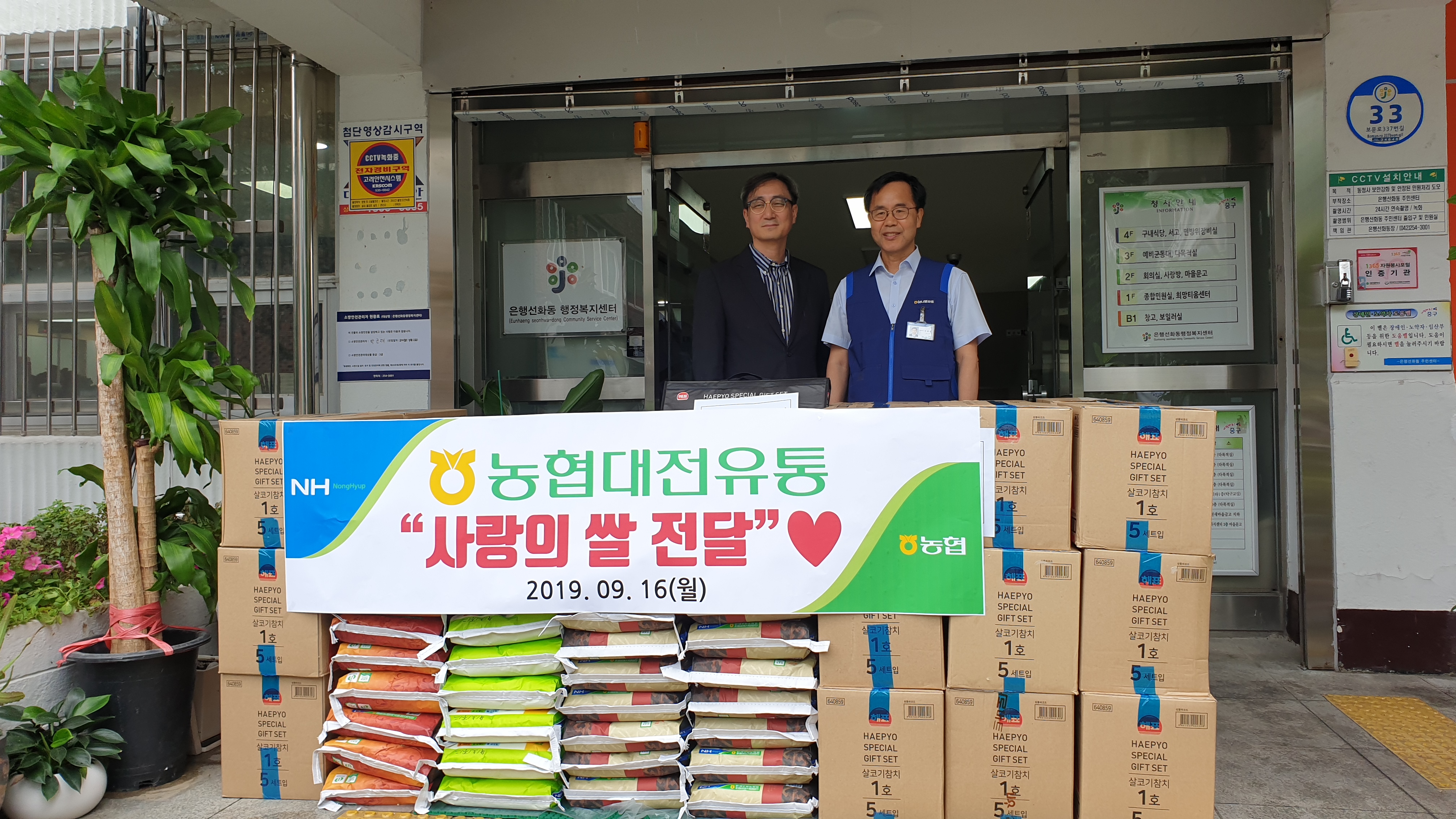이종우 농협대전유통 대표이사(오른쪽)가 9일 대전 중구 은행선화동 행정복지센터를 찾아 ‘사랑의 쌀’ 700kg을 전달하고 있다. 농협대전유통은 매년 추석과 설 명절 어려운 이웃들과 함께하는 명절분위기를 위해 행정복지센터 등에 쌀을 기탁하고 있다. 농협중앙회 대전지역본부 제공