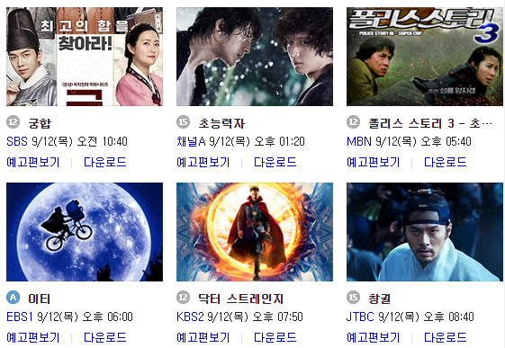 본격적인 추석 연휴인 12일에는 △SBS, 오전 10시40분 ‘궁합’ △채널A, 오후 1시20분 ‘초능력자’ △MBN, 오후 5시40분 ‘폴리스 스토리3’ △EBS1, 오후 6시 ‘ET’ △KBS2, 오후 7시50분 ‘닥터 스트레인지’ △JTBC, 오후 8시40분 ‘창궐’ △SBS, 오후 9시45분 ‘국가 부도의 날’ △tvN, 오후 11시 ‘미쓰백’이 방영된다.