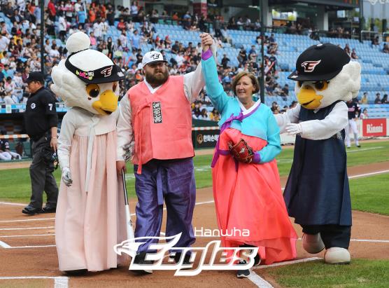 지난 14일 대전 한화생명이글스파크에서 열린 프로야구 한화이글스와 롯데자이언츠의 경기에서 한화의 외국인 투수 워윅 서폴드의 어머니와 형이 추석 연휴를 맞아 한복을 입고 각각 시구, 시타를 한 뒤 손을 맞잡고 관중들의 환호에 답례하고 있다. 한화이글스 제공