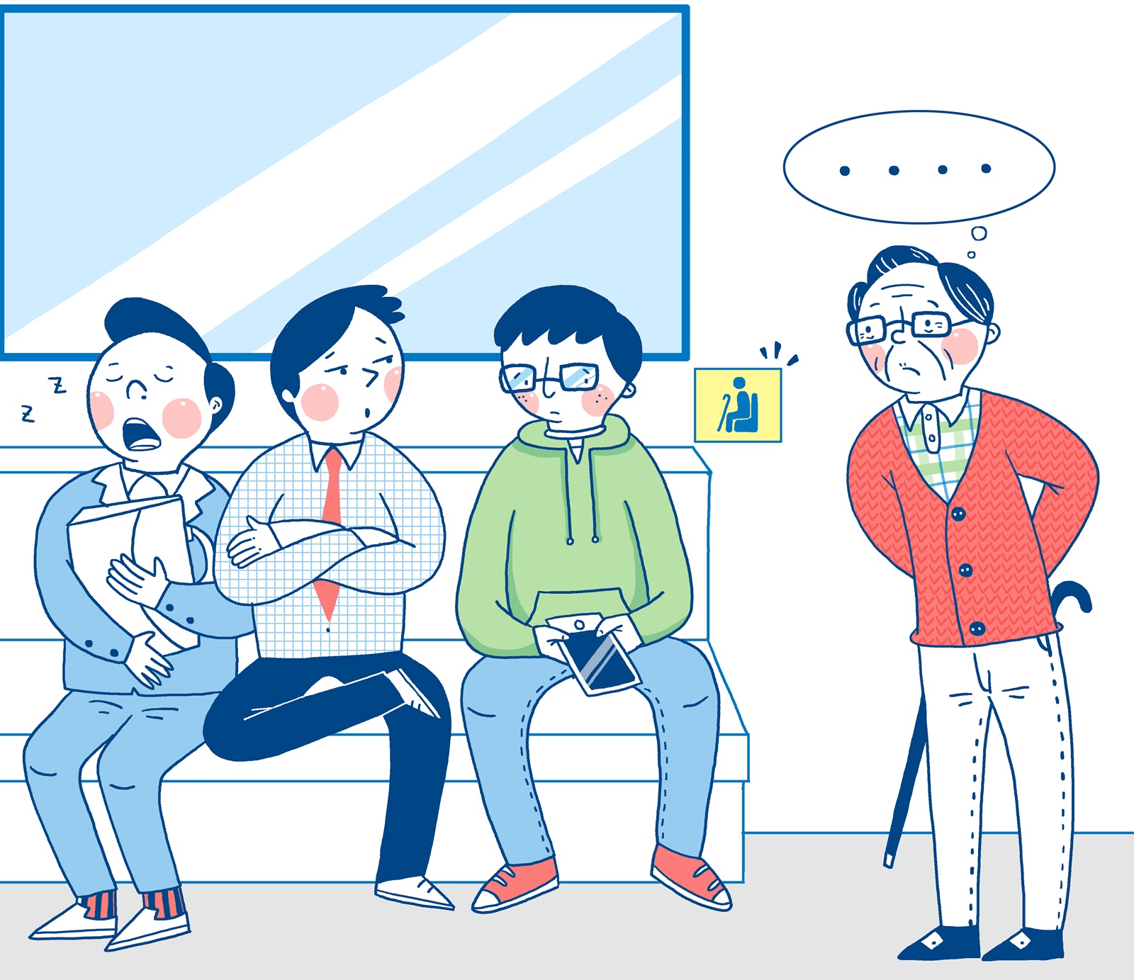 괜히 젊은 사람들 앉아있는 곳 앞에 얼쩡거리면서 ‘어른이 앞에 있는데 앉으라는 말도 하지 않고, 역시 요즘 애들은 버릇이 없어’라고 생각한다면 자기는 물론 휴대전화를 들여다보고 있는 젊은이들도 마음이 불편해지기 때문이다.