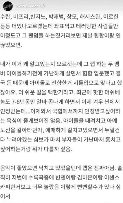 끝으로 그는 "음악이 좋았으면 닥치고 있었을 텐데 랩은 진짜 아님"이라고 해당 아이돌 그룹의 실력을 비판하며 "솔직히 저번에 수록곡 중에 빈첸이랑 김하온이랑 이센스 카피한 거 보고 너무 놀랐다. 이렇게 뻔뻔할 수가 있나 싶어서"라고 글을 마무리했다.