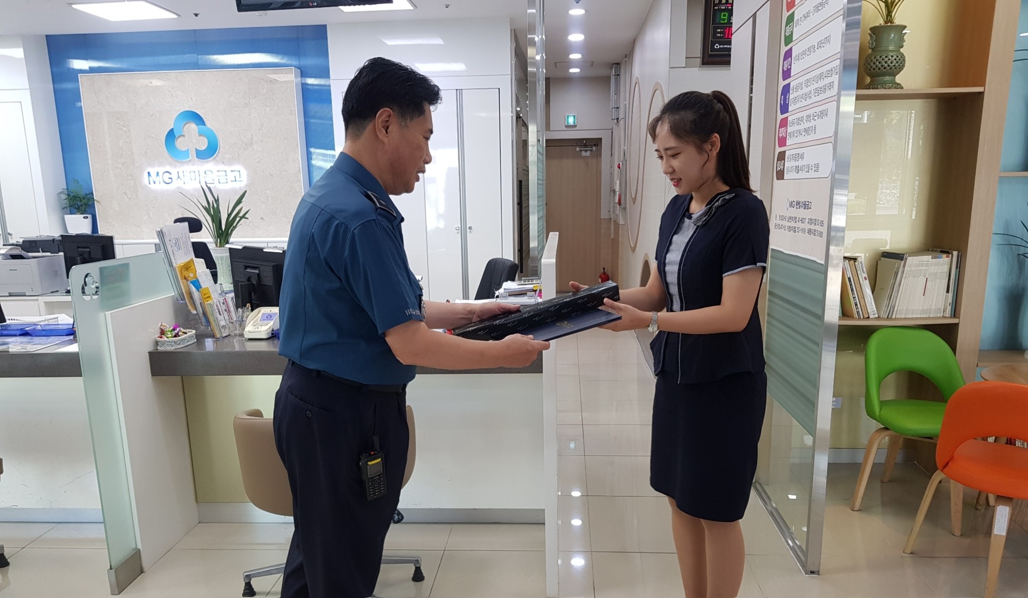 한밭새마을금고 둔산지점에 근무하는 김하경 주임(오른쪽)이 보이스피싱으로부터 고객의 소중한 재산 2000여만 원을 지켜내 지난 17일 김종범 둔산경찰서장으로부터 감사장을 받고 있다. 한밭새마을금고 제공