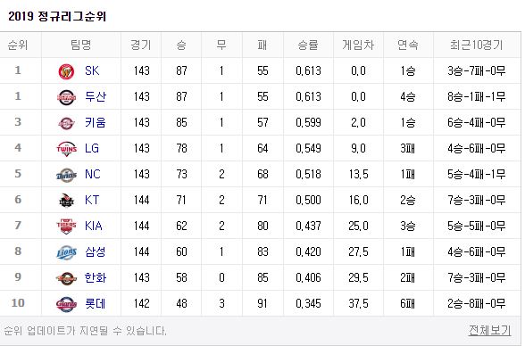 이 결과에 따라 SK와 두산의 순위가 뒤바뀔지 아니면 그대로 우승 할지 향방이 가려질 예정이다.