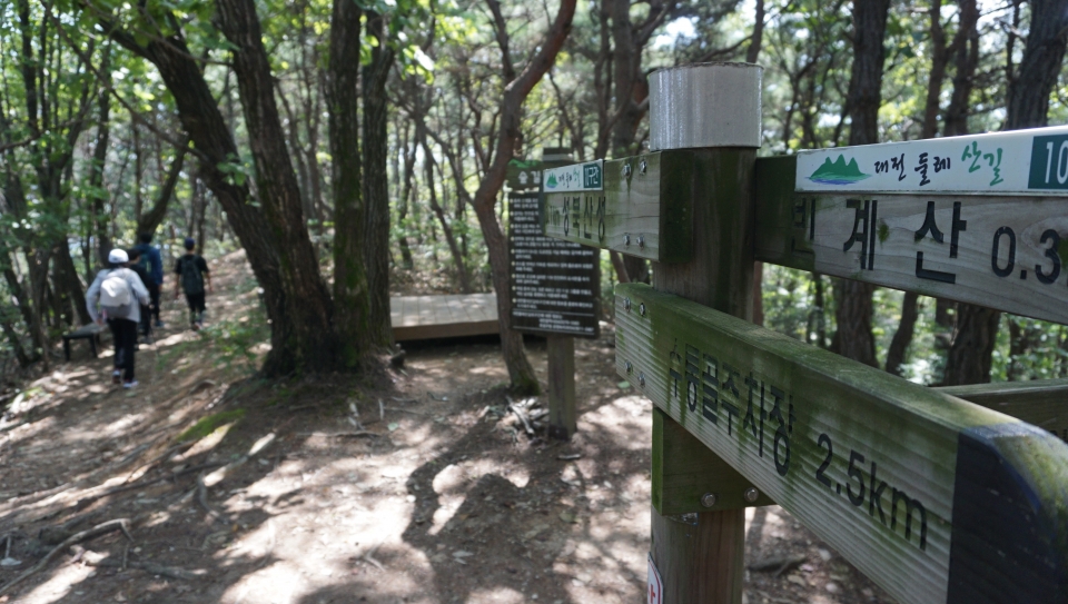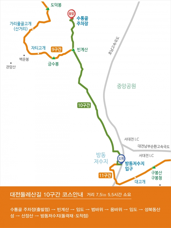 대전둘레산길 10구간은 수통골주차장에서 출발해 빈계산(414m)에 오른 뒤 성북산성, 산장산(265m)을 거쳐 방동저수지 입구까지 이어지는 약 8㎞ 코스다. 소요시간은 대략 쉬엄쉬엄 6시간 정도 잡으면 된다. 둘레산길 전체 12구간 가운데 가장 짧고 빈계산에 오르는 초반 약 1시간을 제외하면 그 이후론 산줄기가 완만하게 펼쳐져 있어 수월하게 산행을 즐길 수 있다. 오른쪽으론 계룡산 줄기가 장쾌하게 펼쳐지고 왼쪽으론 벼가 노랗게 익어가는 대전의 새로운 모습을 조망할 수 있다.