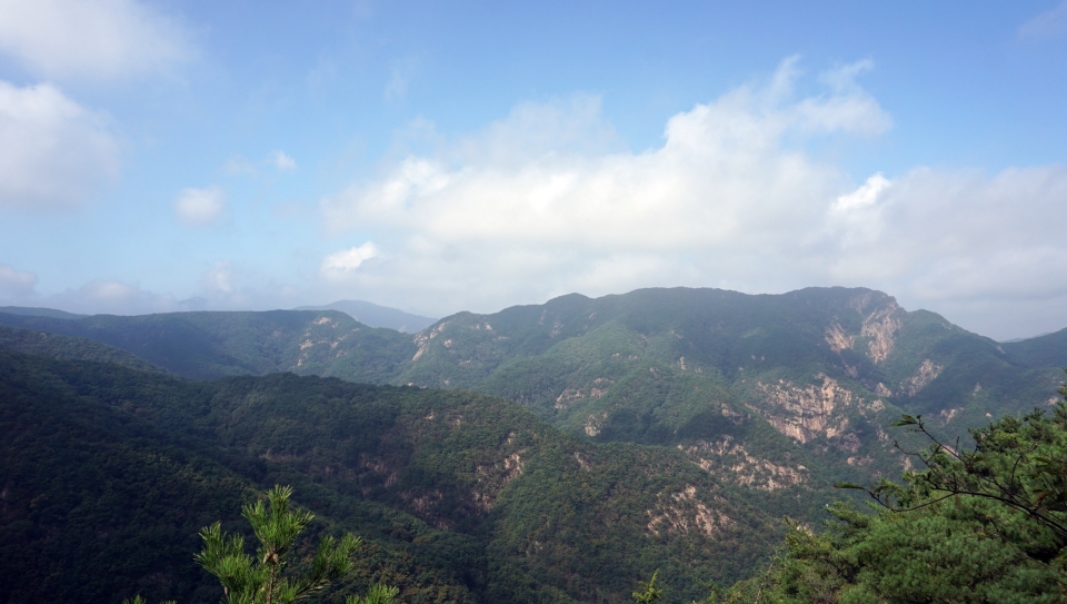 가을태풍의 영향으로 수통골의 주요 봉우리들이 안개에 휩싸였다. 산 정상 조망을 맛볼 수 없을지도 모른다는 걱정을 안고 산행을 시작한다. 오후부터 차차 갠다는 기상청의 예보를 믿어보는 수밖에. 고단한 오르막이 끝없이 이어진다. 돌계단 한 번 오르고 쉬고, 나무계단 한 번 오르고 쉬고, 나무 벤치를 만나면 또 한 번 쉬고, 열심히 밤 까먹는 청설모 구경하며 쉬고, 이렇게 쉬엄쉬엄 산을 오른다. 1시간 정도 오르다 보면 계룡산을 조망할 수 있는 포인트를 만난다. 다행히 안개가 걷히고 파란 하늘이 모습을 드러냈다. 그 파란 하늘 사이사이 뭉게구름이 가을의 정취를 더한다. 9구간에 속한 도덕봉과 금수봉 능선이 한 눈에 들어오고 저 멀리 희미하게 계룡산 천황봉도 조망된다. 도덕봉의 암벽은 어디서 봐도 압권이다. 다시 힘을 내 빈계산 정상으로 향한다. 마지막 3분 젖 먹던 힘을 다해 오르막 한 구간으로 오르면 빈계산 정상 표지를 만난다. 많은 등산객들이 이곳을 찾기 때문에 정상 주변엔 널찍한 평상도 많이 준비돼 있다.