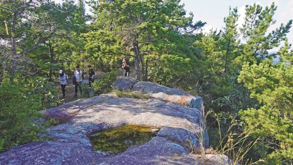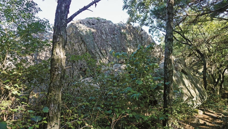 눈길을 사로잡고 발길을 붙잡는 끝내주는 조망을 뒤로하고 다시 길을 잡는다. 10분 정도 발걸음을 옮기면 범상치 않은 거대한 바위를 발견하게 되는데 바로 ‘범바위’다. 산 아래 마을에서 바라보면 용맹한 호랑이가 느긋하게 휴식을 취하는 모습이라는데 이 호랑이 바위가 마을을 지켜보면서 마을의 안녕과 평안을 지켜준다. 5분 정도 더 가면 범바위보다 더 큰 바위를 만나게 된다. ‘용바위’다. 신증동국여지승람엔 산장산 용바위에서 계룡이 나왔다고 쓰여 있는데 이 바위 역시 산 아래서 바라보면 70m가 넘는 웅장한 바위가 마치 용이 자세를 잡고 있는 모양새라고 한다. 한 여인이 이곳에서 아이를 낳았는데 이 아이는 나중에 커서 장군이 됐다는 전설도 전한다. 1805년 발간된 충청도읍지엔 용바위와 범바위의 위치가 명확하게 표기돼 있다. 서늘한 바람이 불기 시작하면서 범바위-용바위 구간에선 억새가 뽀얀 솜털을 드러내기 시작했다.