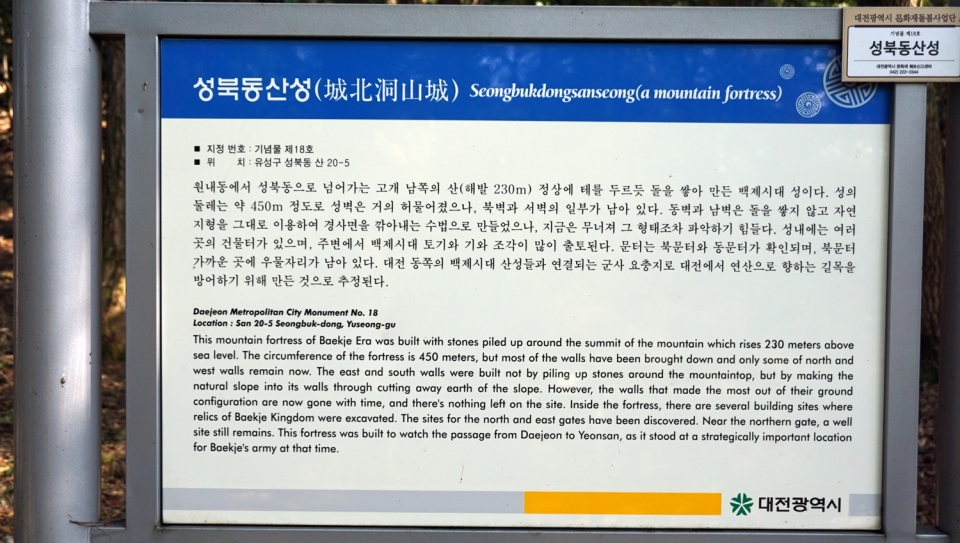 용바위에서 잠시 내리막을 타면 성북동과 대정동을 잇는 또 다른 고갯길(임도)를 만나게 되는데 이곳에서 성북동산성을 만나게 된다. 정확하게 표현하면 산성에 대한 설명 표지판이다. 대부분 허물어져 산성의 형태를 파악할 순 없다. 이 산성은 해발 약 230m 정상에 테를 두르듯 돌을 쌓아 만든 백제시대 산성이다. 성 둘레는 약 450m 정도 되는데 성벽은 거의 다 허물어졌고 북벽과 서벽 일부만 남았다. 동벽과 남벽은 돌을 쌓지 않고 자연지형을 그대로 이용해 경사면을 깎아내는 방법으로 성을 조성했는데 다 무너져 그 형태를 파악하기 어렵다. 성 안에선 여러 개의 건물터가 발견됐고 백제시대 토기와 기와 조각들이 출토됐다. 삼국시대, 이곳은 대전 동쪽의 산성들과 연결되는 군사 요충지로 대전에서 연산으로 향하는 길목을 방어하기 위해 만들어진 것으로 추정된다. 현재 성북동엔 ‘잣뒤’라는 지명이 있는데 성 뒤에 있다는 뜻이다.