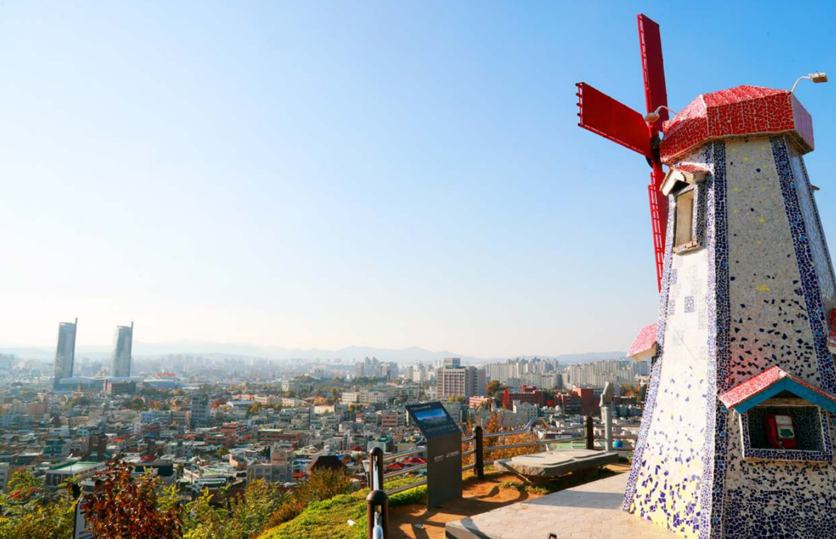 시간이 켜켜이 쌓인 건물의 풍경. 경사진 언덕에 그려진 벽화. 길가에 핀 꽃. 대동의 파란 하늘. 정작 우리를 위로하는 것은 아주 작은 데서 온다. 골목이 주는 위로, 대동하늘공원을 방문할 이유는 충분하다.