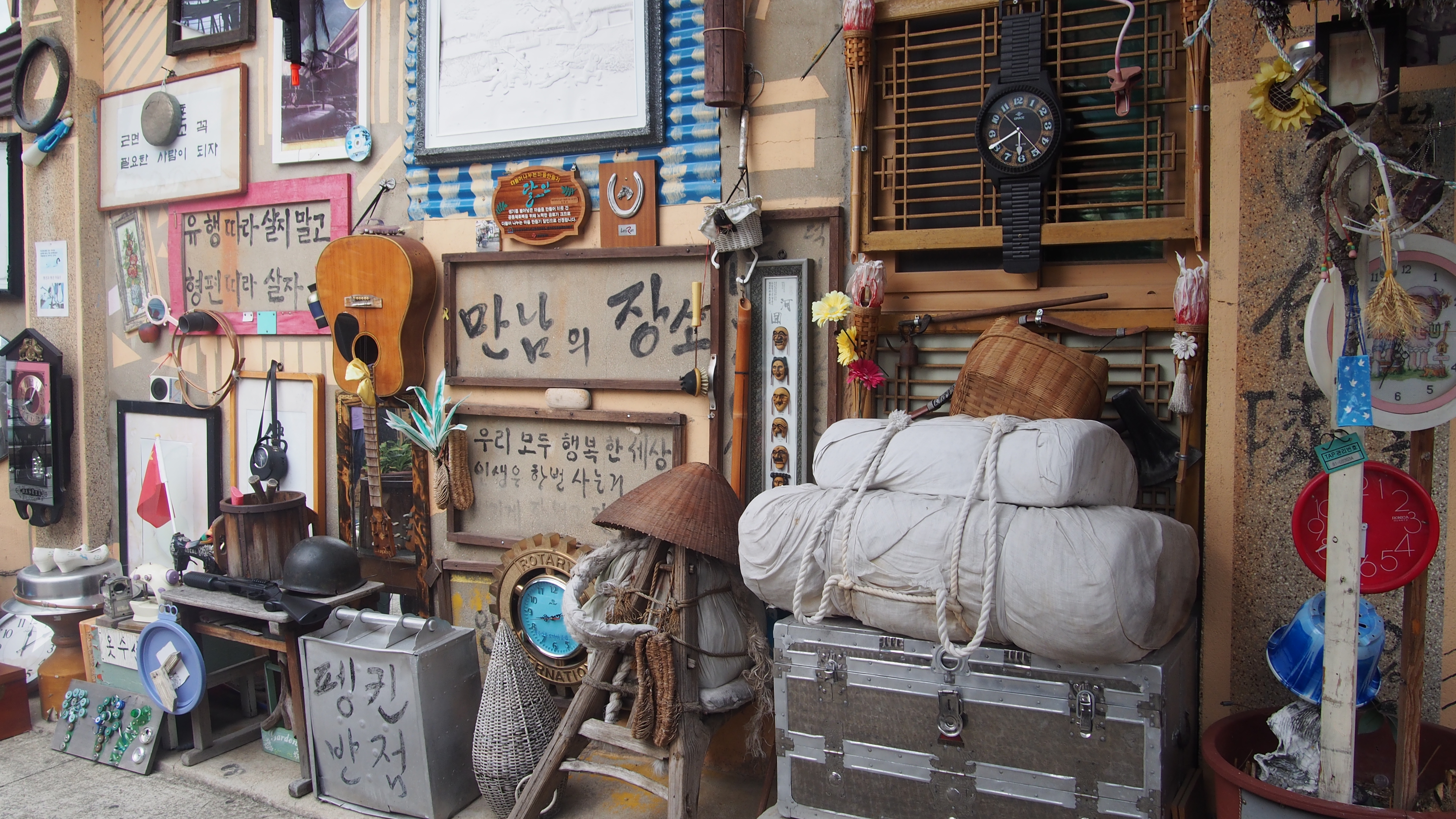 마을 입구에 이르자 예사롭지 않은 경관이 펼쳐졌다. 선풍기 날개로 만든 바람개비, 낡은 담장에 붙어 있는 시계들, 색칠된 주전자 등이 눈길을 사로잡았다. 기대를 한가득 안고 펭귄마을로 가는 화살표가 그려진 팻말을 따라 좁은 골목 안으로 들어갔다. 따닥따닥 붙어있는 집들의 벽면에는 특정하기 어려운 다양한 것들이 붙어 있었다. 시, 그림, 시계, 팻말, 포스터, 공예품, 생활 물품, 악기 등. 마을 전체가 미술관이었다. 옥상에 걸어둔 옷가지, 곳곳에 있는 문 닫힌 빈집, 철골과 목재가 드러나 있는 집마저 하나의 작품처럼 느껴졌다. 무엇이 버려진 물건인지, 무엇이 작품인지 구별이 되지 않았다. 빈집이 있는 지역은 사실상 사람들에게 혐오감을 주기 마련인데 이곳은 오히려 ‘왜?’라는 호기심이 자꾸 생겼다. 어쩌면 여기서는 주민들도, 관광객도 작품일지도 모른다.