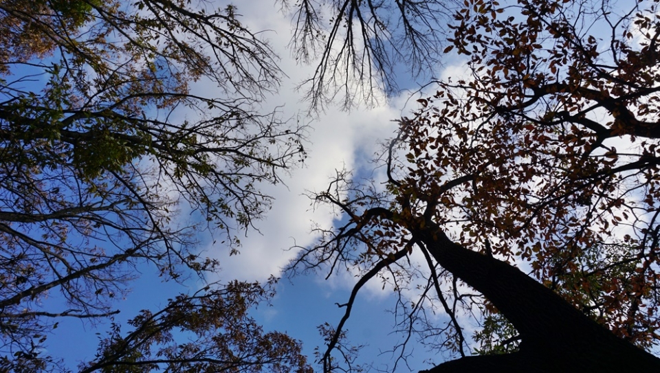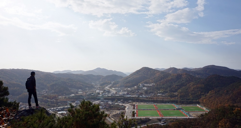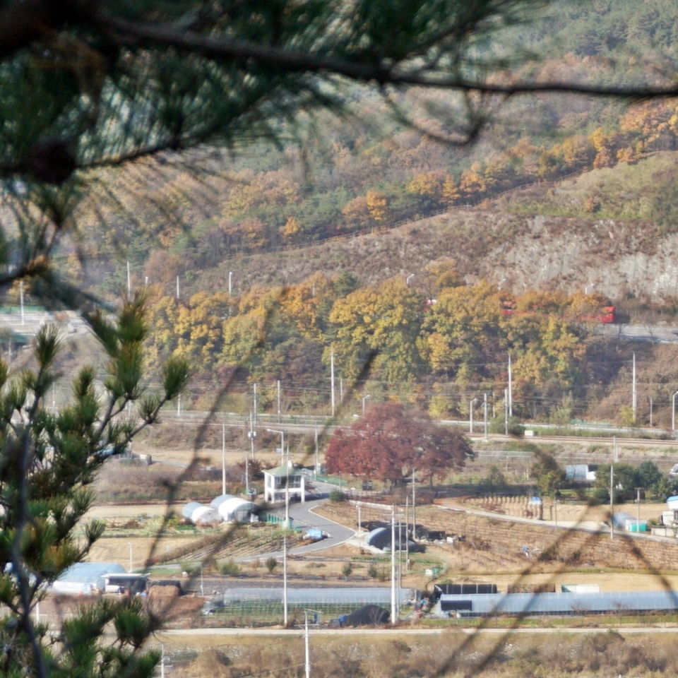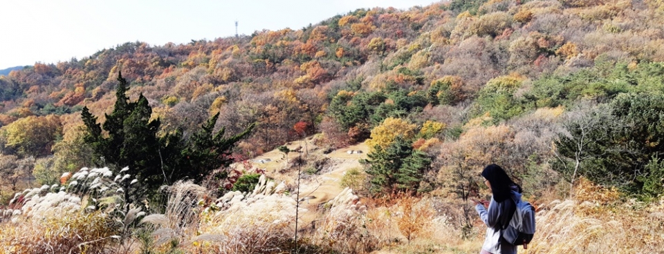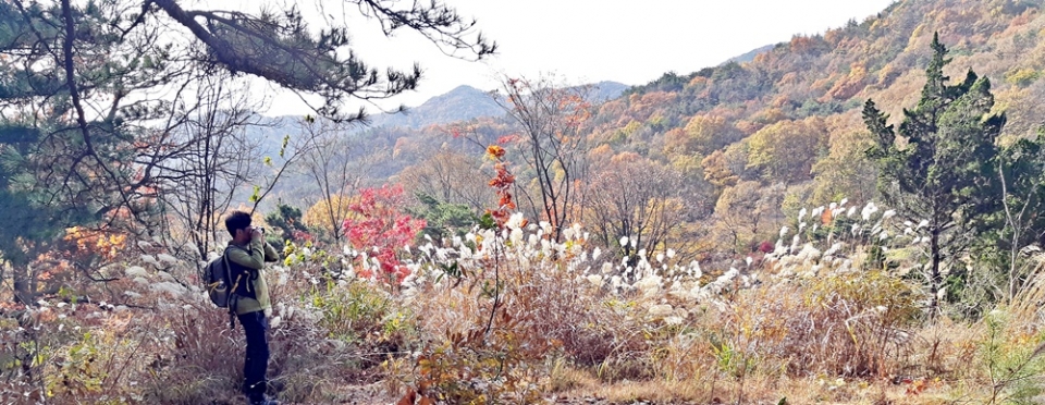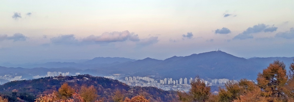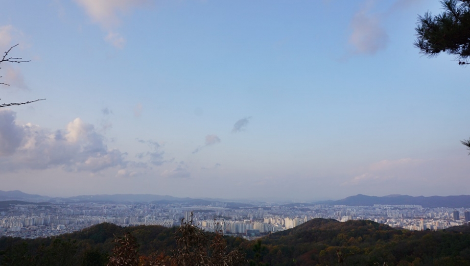 발걸음을 옮겨 중구 방향 샛(새)고개로 향하는데 이 능선은 대전과 충남 금산의 경계다. 바스락 바스락, 바짝 마른 낙엽을 밟으며 천천히 발걸음을 옮긴다. 여름 내내 울창했던 활엽수들은 이제 앙상한 가지만 남겨 등산객들에게 파란 가을하늘을 허락한다. 샛고개에 이르기 전 해철이산을 되돌아본다. 울긋불긋 단풍과 하얀 억새 물결이 어우러져 만추의 고즈넉함을 선사한다. 파란하늘·뭉게구름이 늦가을의 정취를 완성한다. 샛고개에서 중반 산행을 시작한다. 샛고개는 안영동에서 금산 복수면 구만리로 넘어가는 큰 고개를 말하는데 현재는 대전~복수 4차선 도로의 터널이 뚫려 있다. ‘옛날에는 진잠에서 진산으로 가는 길이 두리봉 쪽으로 있었는데 이곳에 새 길이 나게 되면서 새로 난 고개라는 의미로 새고개라 했다’고 전한다.