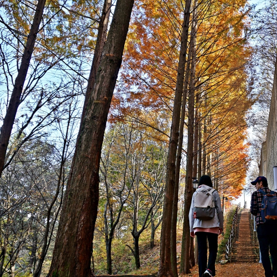 만성산에서 내려와 뿌리공원으로 들어선다. 대전남부순환도로 안영2터널 바로 위다. 시루봉 방향, 뿌리공원으로 진입하면 터널을 지지하는 콘크리트 구조물과 평행선을 그리는 메타세쿼이아 길이 매우 인상적이다. 이 길은 뿌리공원 야영장으로 이어진다. 야영장에서 내려와 만성교를 통해 유등천을 건너고 다시 산행에 나선다. 본격적인 보문산 구간이다.
