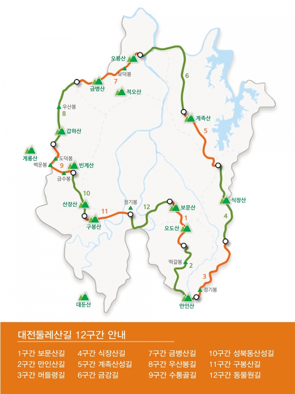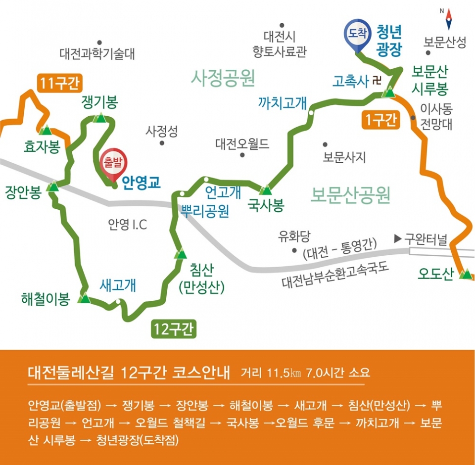 대전둘레산길의 마지막 구간인 12구간은 대전 중구 안영교에서 시작해 쟁기봉, 장안봉, 해철이산 등 중구와 서구의 경계를 따라 걷다 다시 중구로 진입, 침산(만성산), 언고개, 국사봉을 거쳐 둘레산길의 시발점인 보문산 시루봉에 도달하는 코스로 이뤄져 있다. 공식구간은 약 12㎞, 7시간이 소요된다. 봉우리들의 고도가 높진 않지만 오르내림이 많아 산행이 만만찮다. 그러나 대전둘레산길 마지막 구간이라는 상징적 의미는 발걸음을 옮기는 큰 동력으로 작용한다. 종착지인 시루봉이 457m로 비교적 높지만 능선이 완만하게 형성돼 있어 큰 무리가 따르진 않는다.