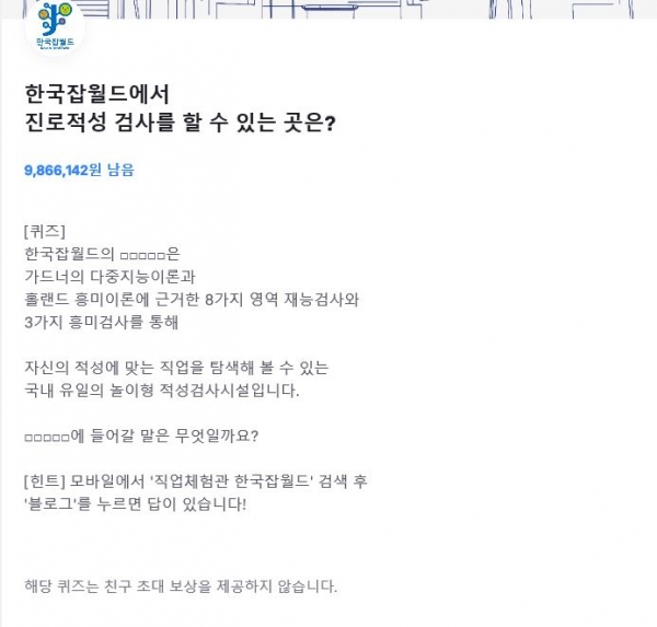 네이버에서 '직업체험관 한국잡월드'을 검색 후 '블로그'를 누르면 힌트를 얻을 수 있다.