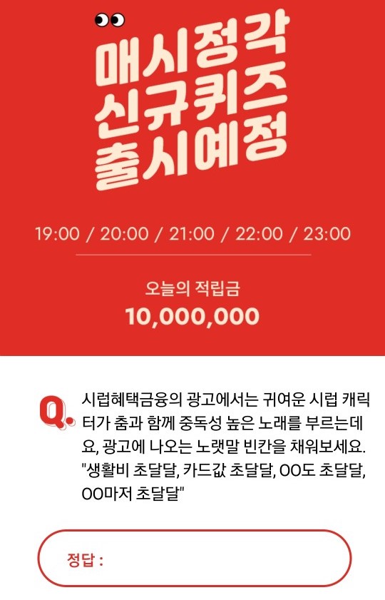 '시럽혜택금융1억이벤트' X 오퀴즈 오후 11시까지 매시간 바뀌는 퀴즈 정답은?