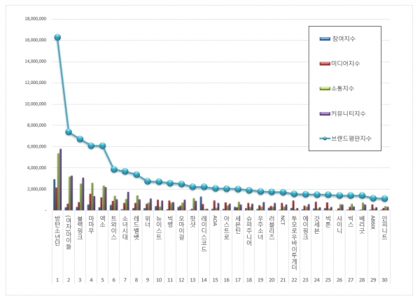 2019년 11월 아이돌그룹 100대 브랜드평판 30위 순위는 방탄소년단, (여자)아이들, 블랙핑크, 마마무, 엑소, 트와이스, 소녀시대, 레드벨벳, 위너, 뉴이스트, 빅뱅, 오마이걸, 핫샷, 레이디스코드, AOA, 아스트로, 세븐틴, 슈퍼주니어, 우주소녀, 러블리즈, NCT, 투모로우바이투게더, 에이핑크, 갓세븐, 빅톤, 샤이니, 빅스, 베리굿, AB6IX, 인피니트 순으로 분석되었다.