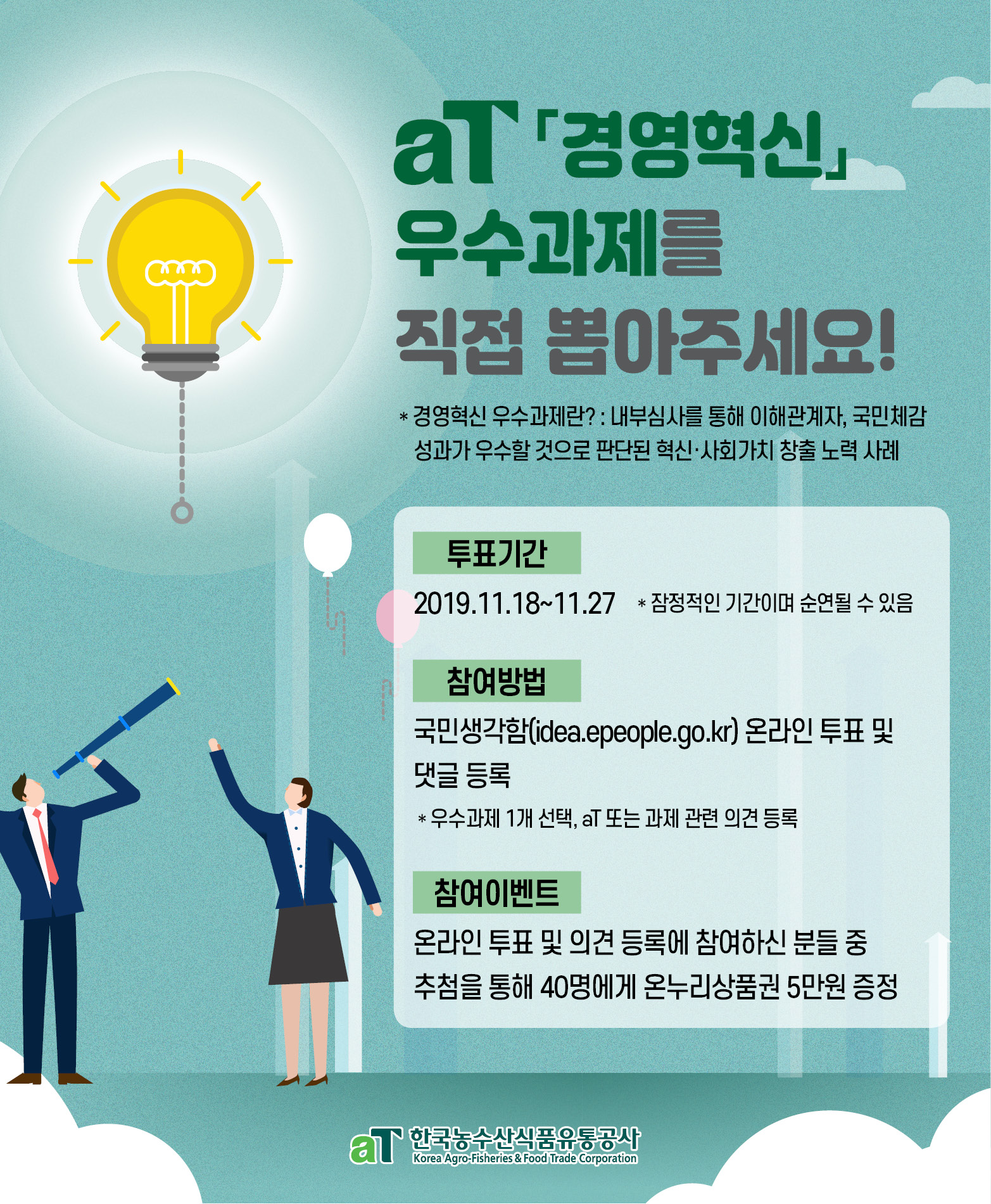 한국농수산식품유통공사(aT)는 오는 28일까지 경영혁신 우수과제에 대해 온라인 국민투표를 진행한다.
