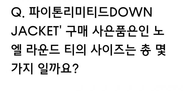 28일 무신사 아이더 박보검 다운 문제 "파이톤리미티드DOWN JACKET' 구매 사은품은인 노엘 라운드 티의 사이즈는 총 몇가지 일까요?"이다.