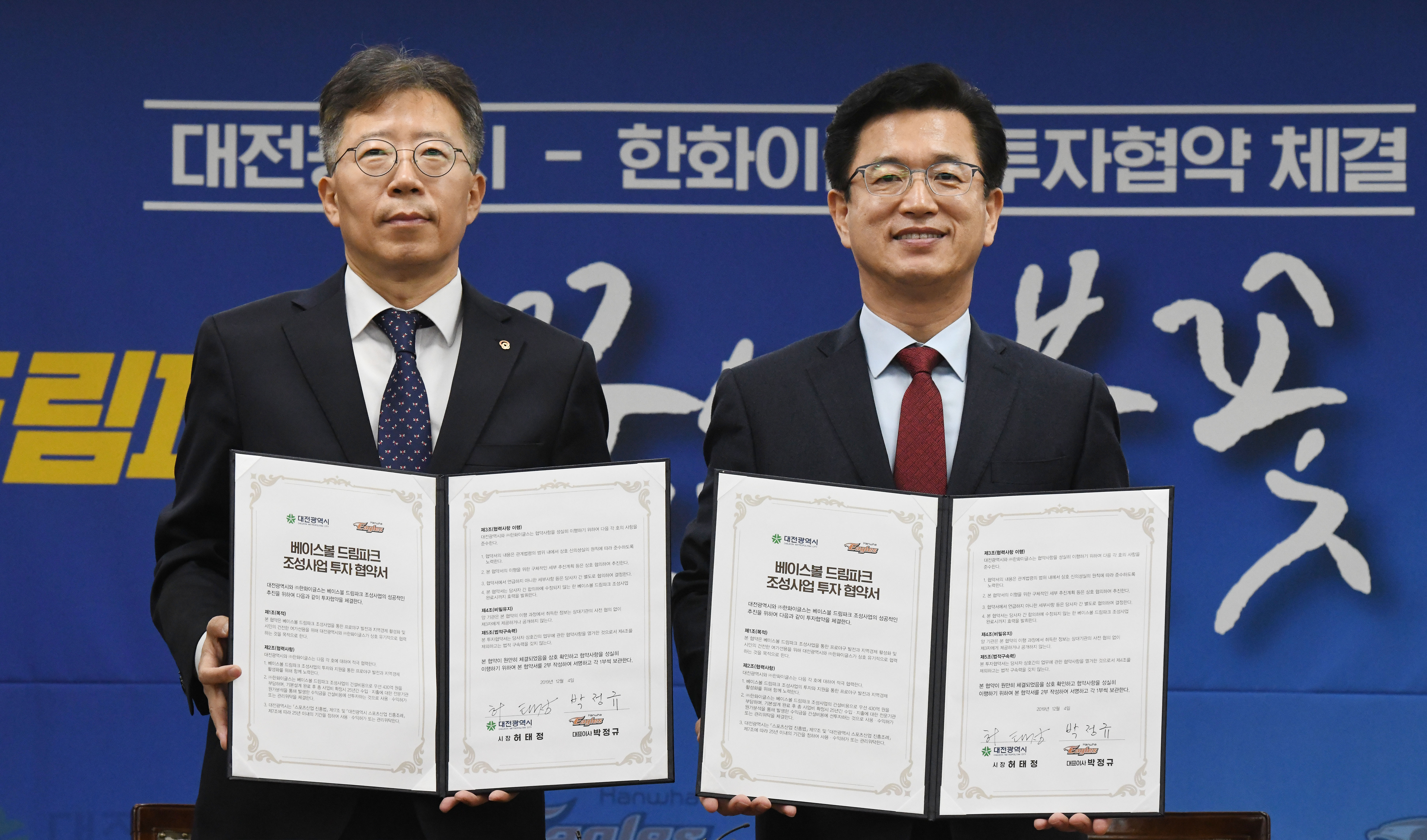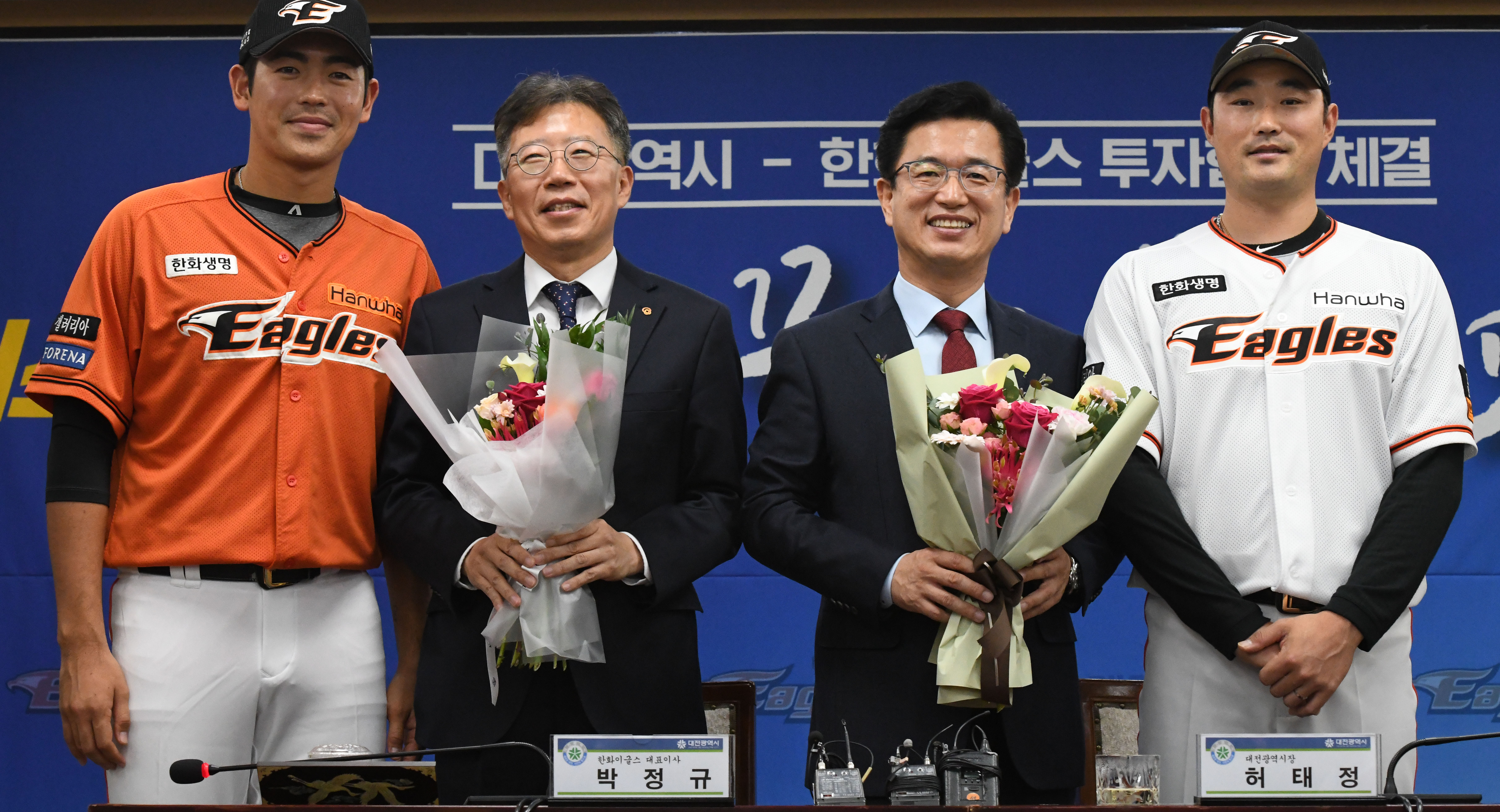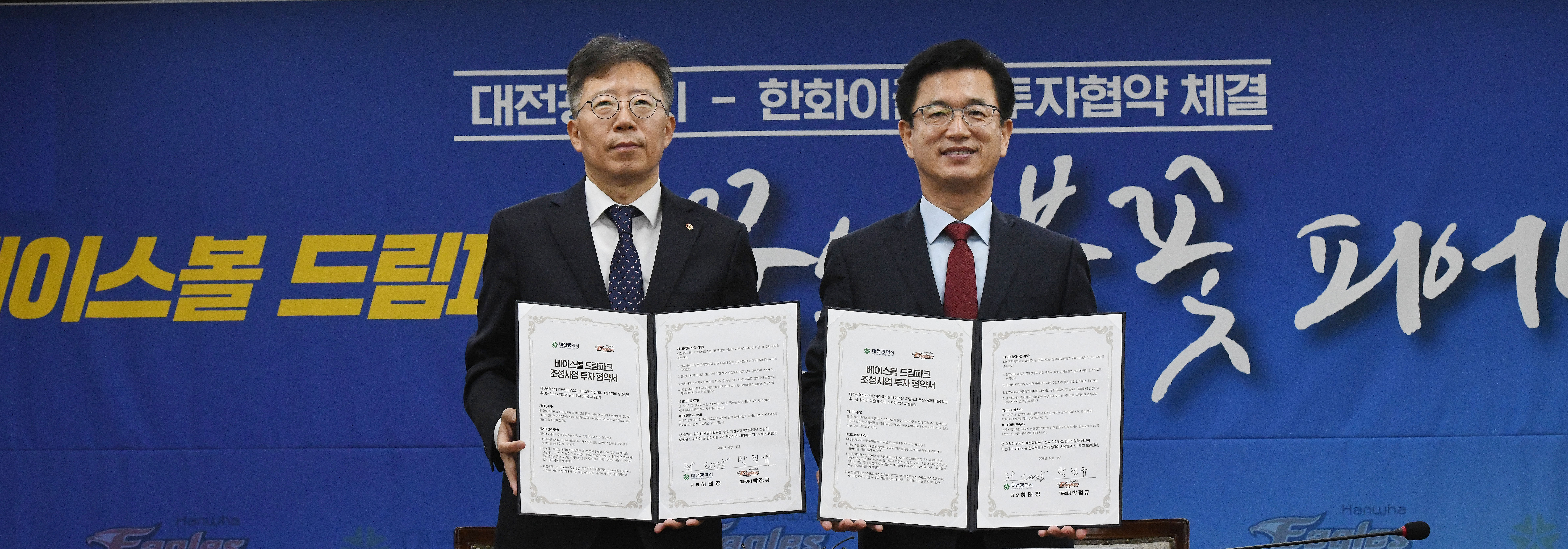 베이스볼 드림파크 조성사업 투자협약식이 4일 대전시청 중회의실에서 열려 허태정 대전시장(오른쪽)과 박정규 한화이글스 대표이사가 협약식을 마치고 기념촬영을 하고 있다. 함형서 기자 foodwork23@ggilbo.com