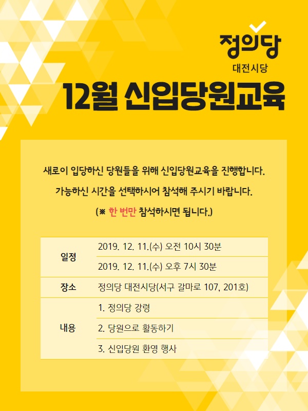 ▲정의당 대전시당 12월 신입당원 교육=12월 11일 오전 10시 또는 오후 7시 30분, 서구 갈마로 107 시당사 ☎042-334-1219 저작권자 © 금강일보 무단전재 및 재배포 금지 금강일보 admin@ggilbo.com 다른기사 보기 SNS 기사보내기 이메일(으)로 기사보내기 다른 공유 찾기 기사스크랩하기 댓글삭제 삭제한 댓글은 다시 복구할 수 없습니다. 그래도 삭제하시겠습니까? 비밀번호 닫기 기사 댓글 0 댓글 접기 댓글입력 권한이 없습니다. 댓글 내용입력 비회원 로그인 이름 비밀번호 댓글 내용입력 댓글쓰기 계정을 선택하시면 로그인·계정인증을 통해 댓글을 남기실 수 있습니다. 회원 로그인 비회원 글쓰기 이름 비밀번호 자동등록방지 로그인 옵션 창닫기 추천기사 [오늘의 금값시세] 11월 26일 금시세(순금·24k)는? 노타 주가, 급등... 호재는? [오늘의 운세] 26일 수요일 나의 운세는?