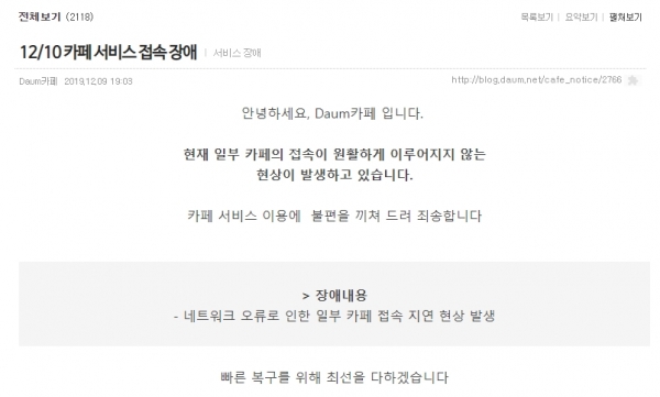 장애내용은 네크워크 오류로 인한 일부 카페 접속 지연 현상이며 다음 측은 "빠른 복구를 위해 최선을 다하겠다"고 전했다.