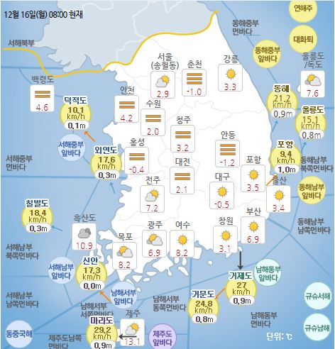 현재 아침기온은 서울 2.9도 대전 2.1도 대구 -0.5도 부산 6.9도로 비교적 쌀쌀한 날씨를 보여 옷차림 단단히 하는 것이 좋겠다.