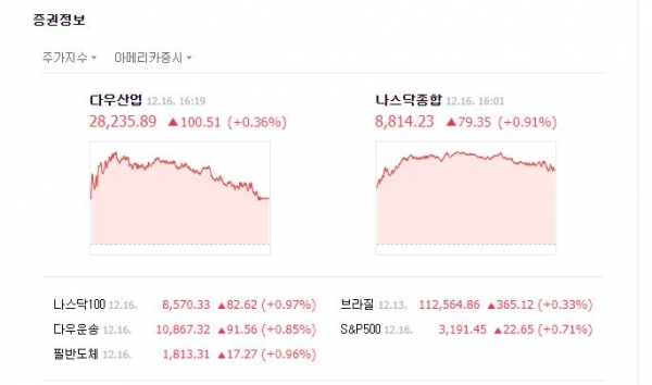이날 다우지수는 100.51포인트(0.36%) 오른 2만8235.89에 거래를 마감했다. S&P500 지수는 22.65포인트(0.71%) 오른 3191.45에, 나스닥지수는 79.35포인트(0.91%) 상승한 8814.23에 각각 거래를 마감지었다.