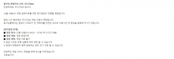 업데이트 시간은 새벽 4시 30분부터 7시까지 진행된다.