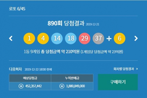 21일 동행복권이 추첨한 제 890회 1등 당첨 번호는 '1, 4, 14, 18, 29, 37'이다.