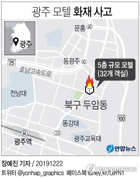 광주 북부소방서 등에 따르면 이날 오전 5시 45분께 북구 두암동 한 모텔에서 불이 났다.