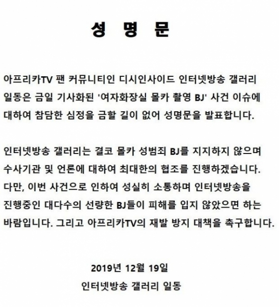 성명문에는 인방갤 일동은 "아프리카TV 팬 커뮤니티인 디시인사이드 인터넷 방송 갤러리 일동은 금일 기사화된 '여자 화장실 몰카 촬영 BJ' 사건 이슈에 대하여 참담한 심경을 금할 길이 없다"라며 말을 시작했다. 이어 "인터넷 방송갤러리는 몰카BJ를 지지않지 않으며, 수사 기관 및 언론에 대하여 최대한 협조하겠다"고 밝혔다.