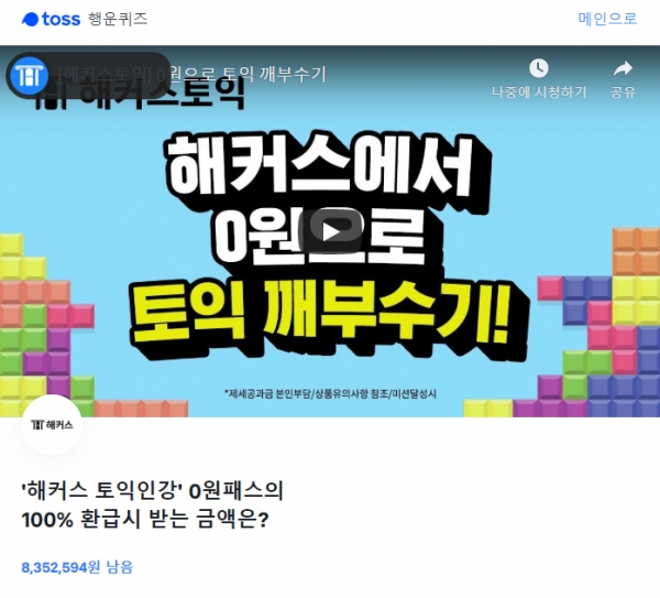 '해커스 토익인강' 토스 행운퀴즈가 화제다.