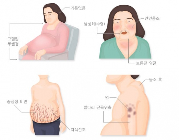쿠싱증후군의 증상으로는 중심성 비만, 고혈압, 피로감과 쇠약감, 무월경, 남성화 등의 증상이 있다. 피부에서도 쿠싱증후군에 특징적인 소견을 관찰할 수 있는데, 쿠싱증후군으로 피부가 얇아지기 때문에 쉽게 멍이 든다면 쿠싱증후군을 의심해 볼 수 있다.