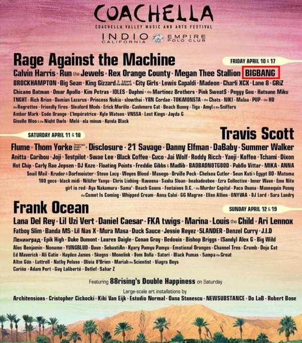최근 해외원정도박, 외국환거래등의 혐의로 경찰조사를 받은 YG엔터테인먼트의 전 대표 프로듀서 양현석이 SNS활동을 재게했다. 그는 10개월만에 자신의 인스타그램 계정을 통해 미국 최대 음악축제인 코첼라 밸리 뮤직&아츠 페스티벌(Coachella Valley Music &Arts Festival)의 포스터를 게재했다. 이 포스터에는 축제에 참가하는 아티스트들의 라인업이 함께 공개되었는데 그 라인업에 빅뱅도 이름을 올렸다. 갑작스런 빅뱅의 컴백소식에 YG엔터테인먼트의 주가도 요동치고있다. 지난해 8월 19,300원까지 곤두박질 치던 주가는 2020년 1월6일 30,000원을 돌파하며 무섭게 오르고있다.