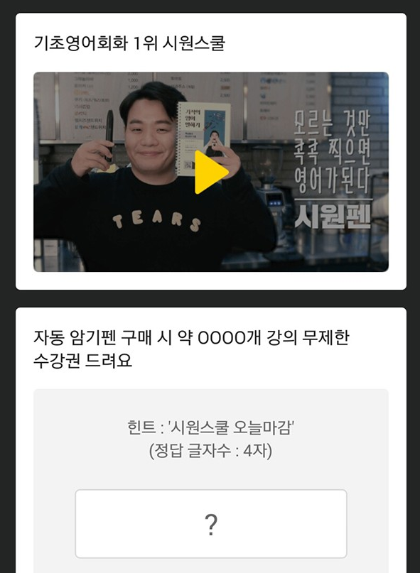 6일 오후 카카오페이지퀴즈에는 "자동 암기펜 구매 시 약 ○○○○개 강의 무제한 수강권 드려요 힌트: '시원스쿨 오늘마감' (정답 글자수 : 4자)"라는 퀴즈가 등장했다.