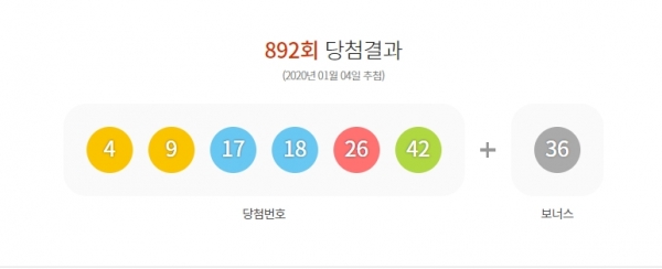 제892회 동행복권 로또 추첨결과 ‘4·9·17·18·26·42’번이 1등 번호로 결정됐다. 2등 보너스 번호는 ‘36’이다.