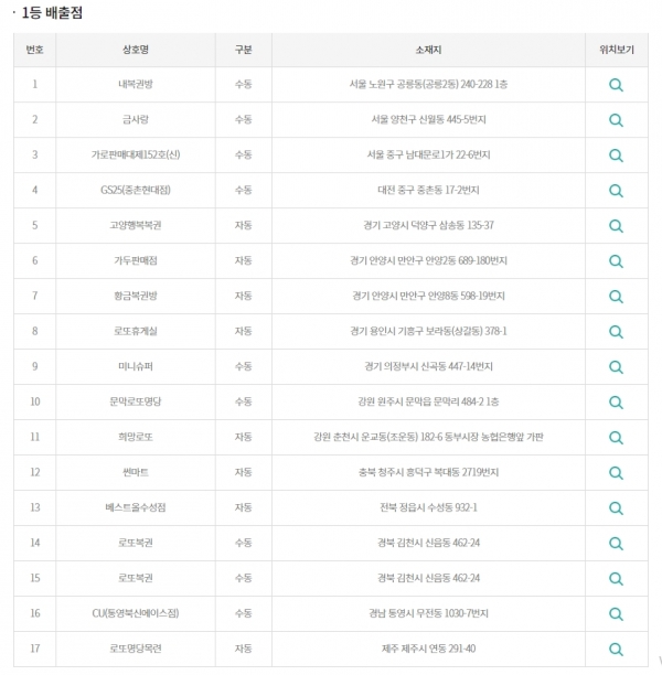 자동으로 복권을 구입한 사람이 8명, 수동으로 구입한 사람이 9명이다. 서울에서 나온 1등 당첨자는 모두 수동으로 복권을 구입했다. 1등 당첨 배출 지역은 서울과 경기, 대전, 강원, 충북, 전주, 경북, 경남, 제주다. 경북에선 같은 곳에서 수동으로 구매한 2명이 1등이 당첨돼 동일인일 가능성이 크다.