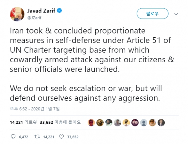 모하마드 자바드 자리프 이란 외무장관이 8일(현지시간) 이라크 미군 기지에 대한 미사일 공격 이후 "이번 공격이 방위 차원에서 이뤄졌으며 이란은 확산이나 전쟁을 추구하지 않는다"는 말을 트위터에 남겼다.