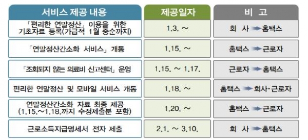 국세청은 2019년 귀속 연말정산 신고 도움 서비스를 국세청 누리집과 홈택스 서비스 등을 통해 제공하고 있다. 연말정산 간소화 서비스는 근로자가 소득·세액공제 증명에 필요한 자료를 국세청이 병원·은행 등 17만 개 영수증 발급기관으로부터 직접 수집해 근로자에게 제공하는 서비스로, 영수증 발급기관에서 추가·수정해 제출하는 자료를 반영한 최종 자료는 20일부터 제공될 예정이다.