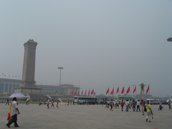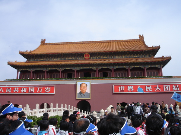 인도에서 천안문광장으로 들어가려면 넓은 차도를 건너는 것이 매우 위험해서 지하도를 통해서 갈 수 있는데, 천안문광장의 동서남북에는 오늘날 중국을 알 수 있는 주요공공기관이 세워져 있다. 광장 중심에는 1958년 2층의 대리석 기단 위에 세운 인민영웅기념비는 국민당정부를 대만으로 몰아낸 뒤 공산국가 완성을 기념하는 탑이고, 인민영웅기념비의 남쪽에는 중국공산당을 확립한 중국의 국부 마오(毛澤東·1893~1976)의 유해가 안치되어 있는 마오 기념관(毛澤東紀念館)이 있다. 1977년에 준공된 마오 기념관은 중국정부가 가장 신성시하는 장소로서 매일 참배객이 줄을 잇고 있다.