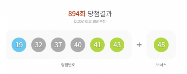 894회 로또 당첨 번호는 19 32 37 40 41 43이며 보너스 번호는 45다.