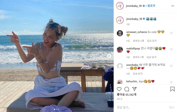 공개된 사진에서는 바닷가에 머물면서 휴식을 취하고 있는 사진을 여러 장 게재했다. 귀여운 헤어스타일에 화장도 거의 하지 않은 지민은 애교 가득한 표정을 보여주면서 행복한 시간을 보냈다.