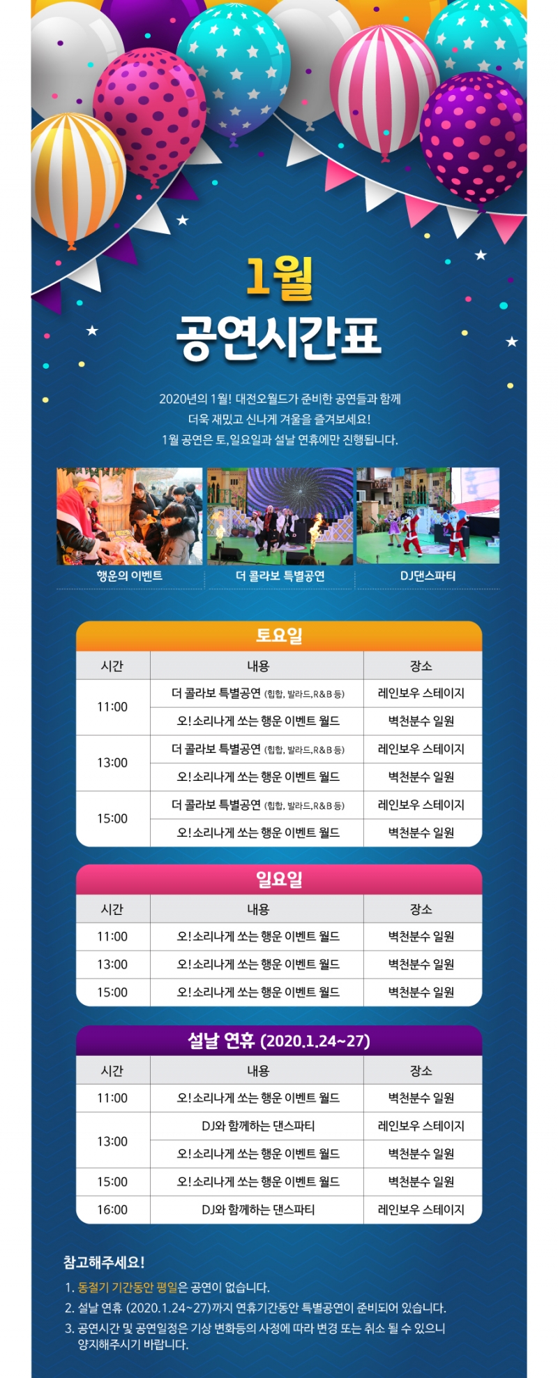 대전오월드에선 27일까지 ‘대전 오월드 홀리데이(Holiday) 댄스 한마당’이 열린다. 다양한 장르의 일렉트로닉 댄스 뮤직(Electronic Dance Music), EDM) 리믹스 공연이 선보인다. 또 별천분수 주변에서는 군고구마 군밤 등 간식제공 이벤트와 추억의 뽑기 대형 돌림판 이벤트 등 다양한 즐길거리가 마련되며 대형 윷놀이와 투호, 제기차기 등 전통놀이 체험 코너, 다양한 콜라보 공연 등이 진행된다. 오월드는 현재 눈썰매장도 운영하고 있다.