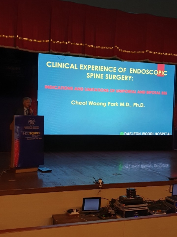 박철웅 대전우리병원 대표병원장이 지난 23일부터 25일까지 인도 뭄바이와 푸네에서 열린 인도척추내시경수술컨퍼런스(IndoScope2020)에서 양방향 내시경과 일측성 내시경의 장단점과 수술법에 따른 한계에 대한 초청강연을 진행했다.