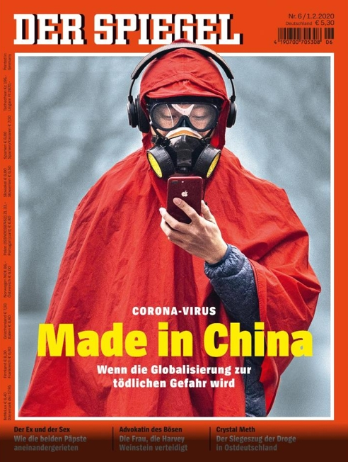 지난 1일 발간된 슈피겔의 표지에서는 '코로나 바이러스(CORONA-VIRUS)'라는 작은 문구 아래 '메이드 인 차이나'라고 조롱 섞인 듯한 문구가 굵은 글씨의 주요 제목으로 사용됐다. 표지 사진은 붉은색 우비를 뒤집어쓰고 방독면을 쓰고 귀마개를 한 채 스마트폰을 보는 사람을 실었다.