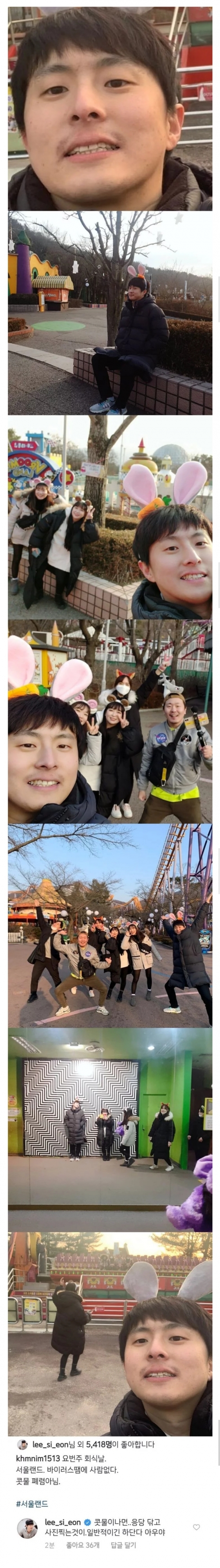 이에 누리꾼들은 “ㅋㅋㅋㅋㅋㅋㅋㅋㅋㅋㅋㅋㅋㅋㅋ둘 관계 진짜 웃겨”, “회식을 놀이동산으로 가다니 ㅋㅋㅋㅋ”, “콧물 왜 안 닦고 찍었어 ㅋㅋㅋㅋㅋㅋ”, “얼장 표정이 보이는 기분 ㅋㅋㅋㅋㅋㅋ” 등의 반응을 보이고 있다.
