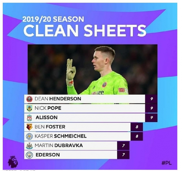 2019-2020 시즌 프리미어리그(EPL) 골키퍼 '클린시트' 경쟁이 치열하다. 셰필드 유나이티드의 딘 헨더슨, 번리 FC의 닉 포프, 리버풀의 알리송 베케르가 클린시트 9개로 공동 1위에 올라있다. 11일 현재 공동 1위에 오른 딘 헨더슨(1997·영국)은 셰필드 유니폼을 입고 올 시즌 아홉 개의 클린시트와 한 차례의 페널티킥 선방으로 팀을 5위에 올려 놓는 등 맹활약을 펼치고 있다. 번리 FC의 닉포드도 아홉 개의 클린시트로 올 시즌 두각을 나타내며 '강호' 첼시의 러브콜을 받고 있다.