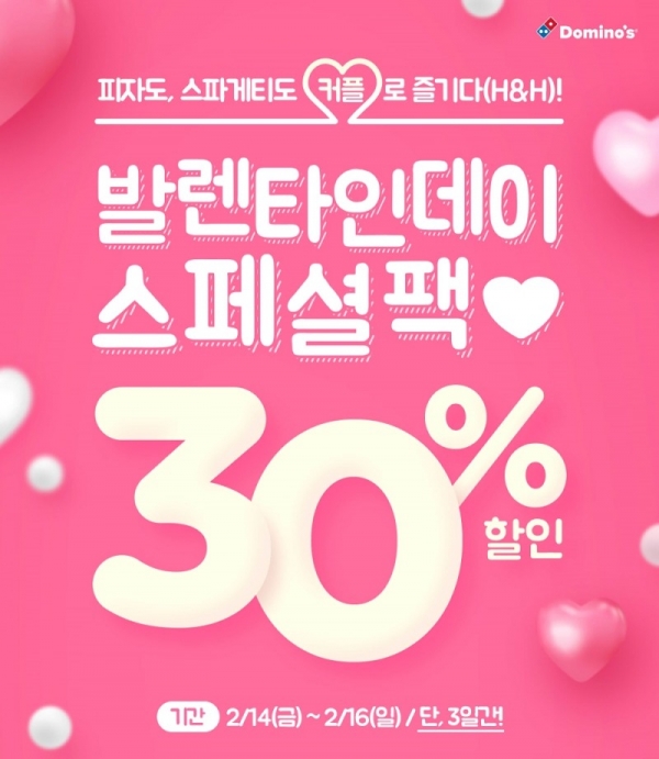 또한 도미노피자가 발렌타인데이를 맞아 특별한 추억을 남길 수 있도록 하프 앤 하프 피자(M)와 하프 앤 하프 스파게티를 배달, 방문포장 주문 모두 30% 할인하는 ‘발렌타인데이 스페셜 패키지’를 오는 14~16일 3일 동안 판매한다고 밝혔다.