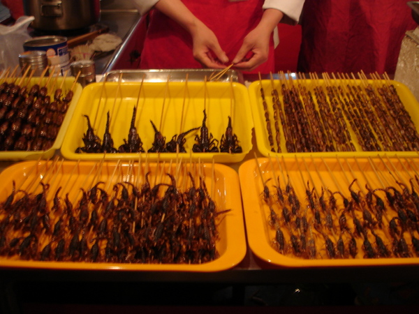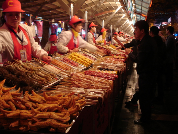 흔히 중국인들은 날아다니는 것은 비행기, 바다에서는 잠수함만 빼고 다 요리할 수 있다고 할 만큼 다양한 먹거리로 유명하지만, 특히 왕푸징거리는 정부에서 장려하기도 하지만, 긴 포장마차의 규모나 수많은 종업원을 보면 거대기업이 운영하는 것 같다. 그동안 세 차례 북경여행을 할 때마다 찾아가는 왕부정거리에서 몬도가네 같은 각종 음식에 엄두도 내지 못했는데, 이번에는 단단히 별렀지만 결국 바라보지도 못하고 말았다. 이런 심정은 이곳을 찾는 다른 외국인들도 마찬가지였는지, 전갈을 먹는 모습을 호기심으로 바라보는 시선에서 느낄 수 있었다.
