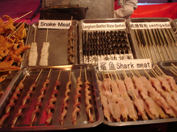 후통에서는 돼지고기나 닭고기 꼬치는 물론 전갈, 개미, 바퀴벌레, 뱀 등 기상천외의 요리가 많다. 최근 중국 우한(武漢) 지방에서 전 세계적으로 큰 위협이 되고 있는 코로나 바이러스의 병원체는 박쥐에서 옮겨졌다는 것이 현재까지의 정설인데, 박쥐고기도 있다.
