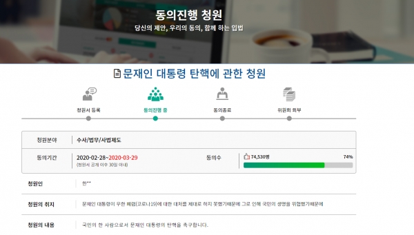 현재 청와대 국민청원 홈페이지에도 코로나19 방역 대응의 문제점을 지적하며 문 대통령의 탄핵을 촉구하는 국민청원이 올라왔고 동의자가 100만명을 돌파한 상태다. 청와대 국민청원은 20만명 이상이 동의한다면 청와대에서 공식 답변을 내놓아야 한다.